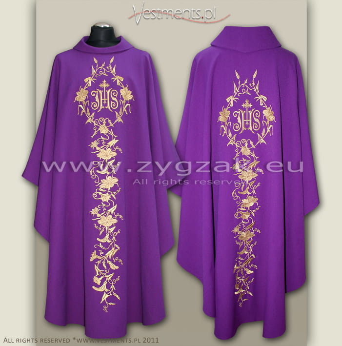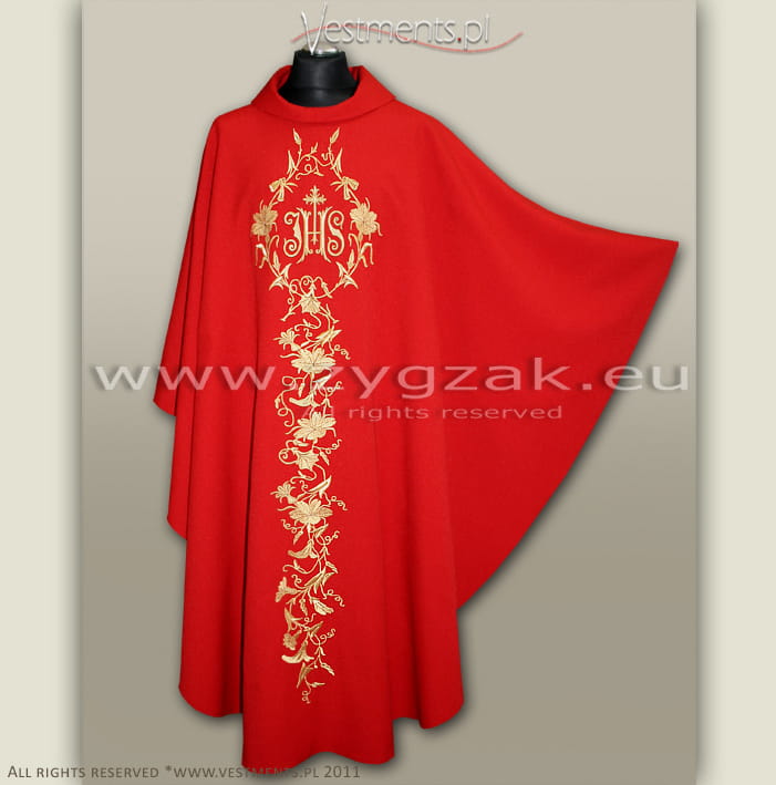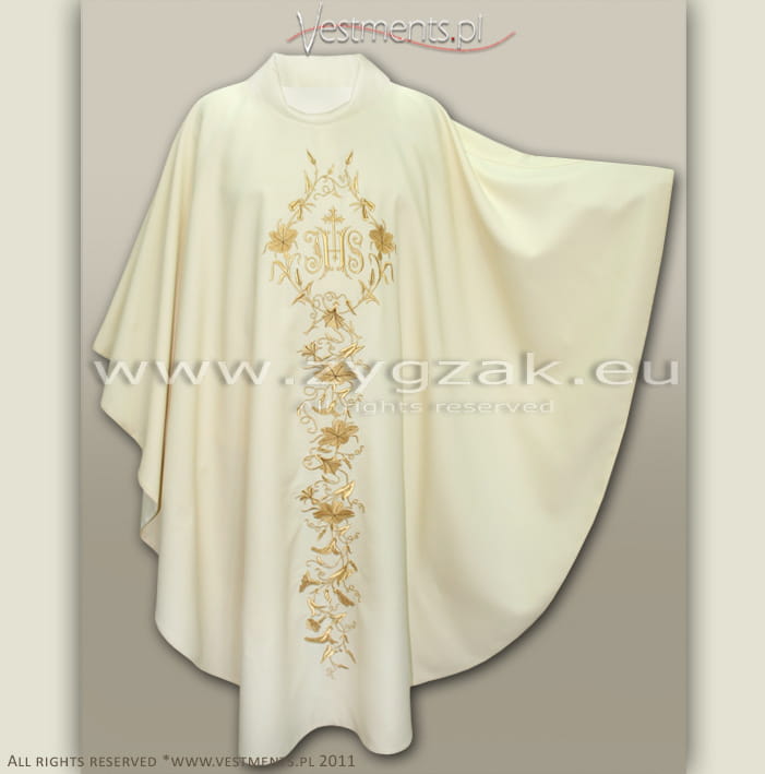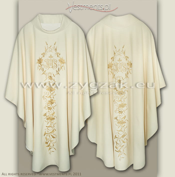 Both sides of the Chasuble richly decorated with gold machine embroidered floral motifs and decorative gold IHS emblem in the centre.